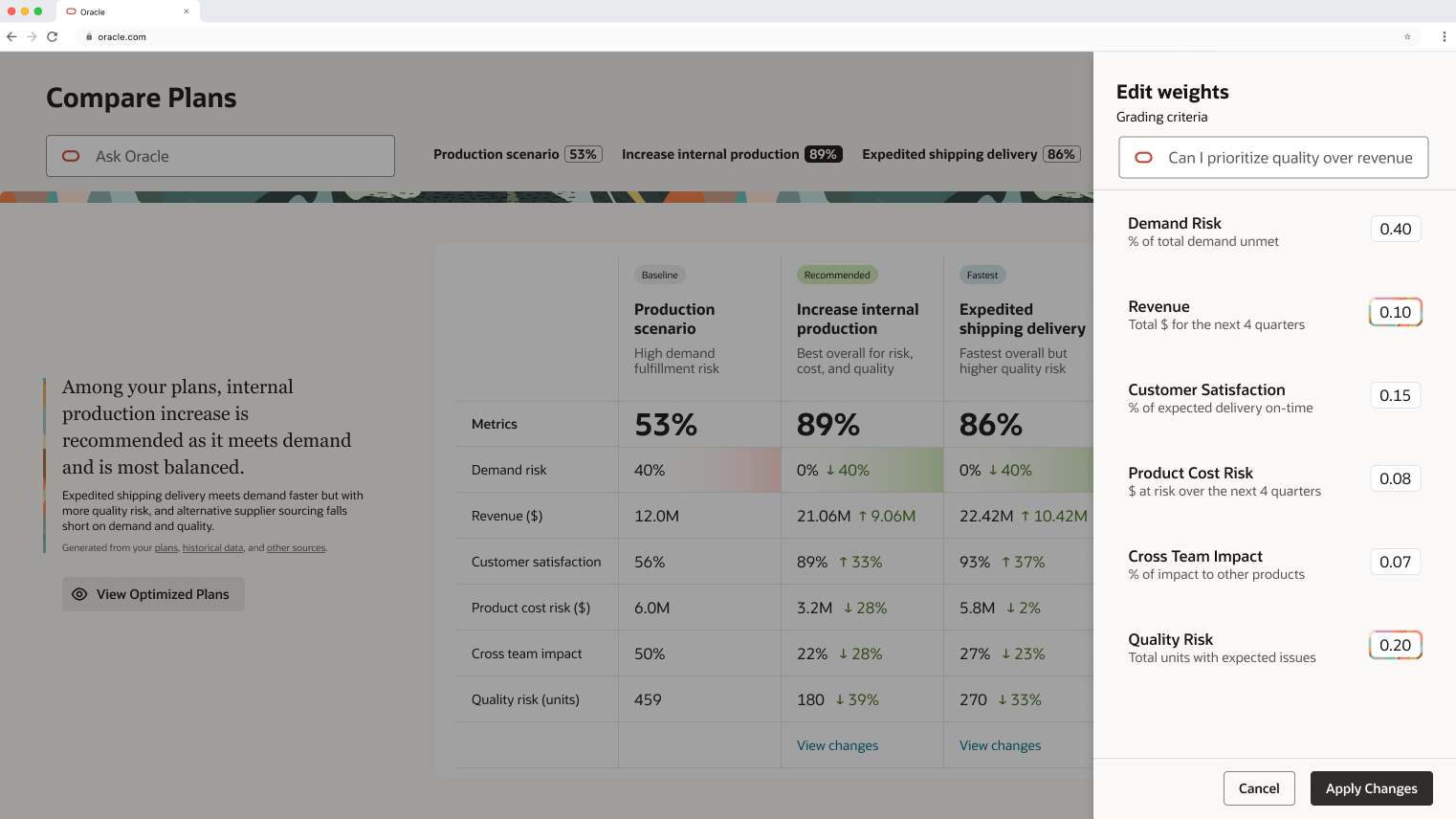 Using Ask Oracle, she adjusts the weights through natural language. The system suggests new values, she applies them, and the grading updates accordingly.