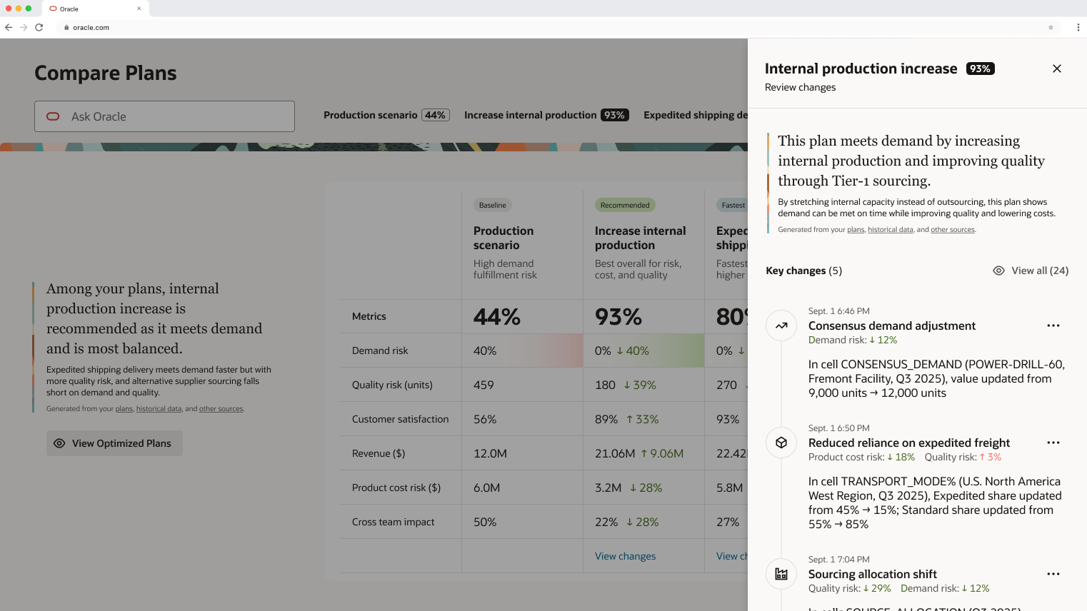 Compare helps supply planners quickly find the most important differences between their plans, with AI uncovering risks, ripple effects, and recommending targeted actions.